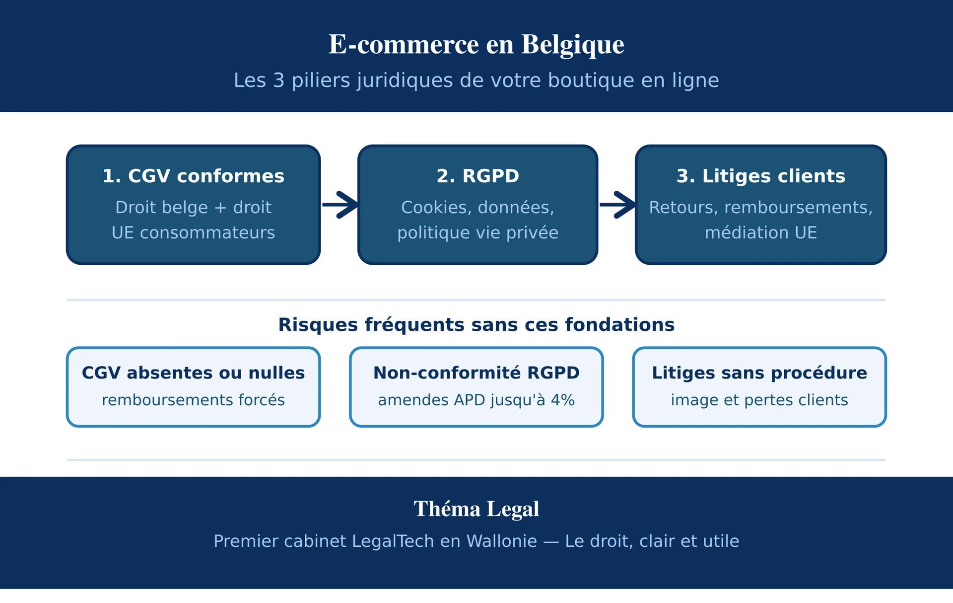 Un e-commerce juridiquement solide, c'est un e-commerce qui peut se concentrer sur sa croissance plutôt que sur ses litiges. Les trois piliers — CGV, RGPD, gestion des litiges — ne sont pas des contraintes. Ce sont les fondations qui vous permettent de vendre sereinement, en Belgique comme dans toute l'Union européenne.